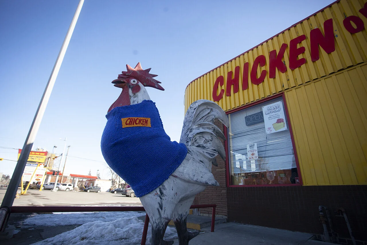 Hand woven sweater for Chicken on the Way chicken statue, 1443 Kensington Rd NW, Calgary, AB